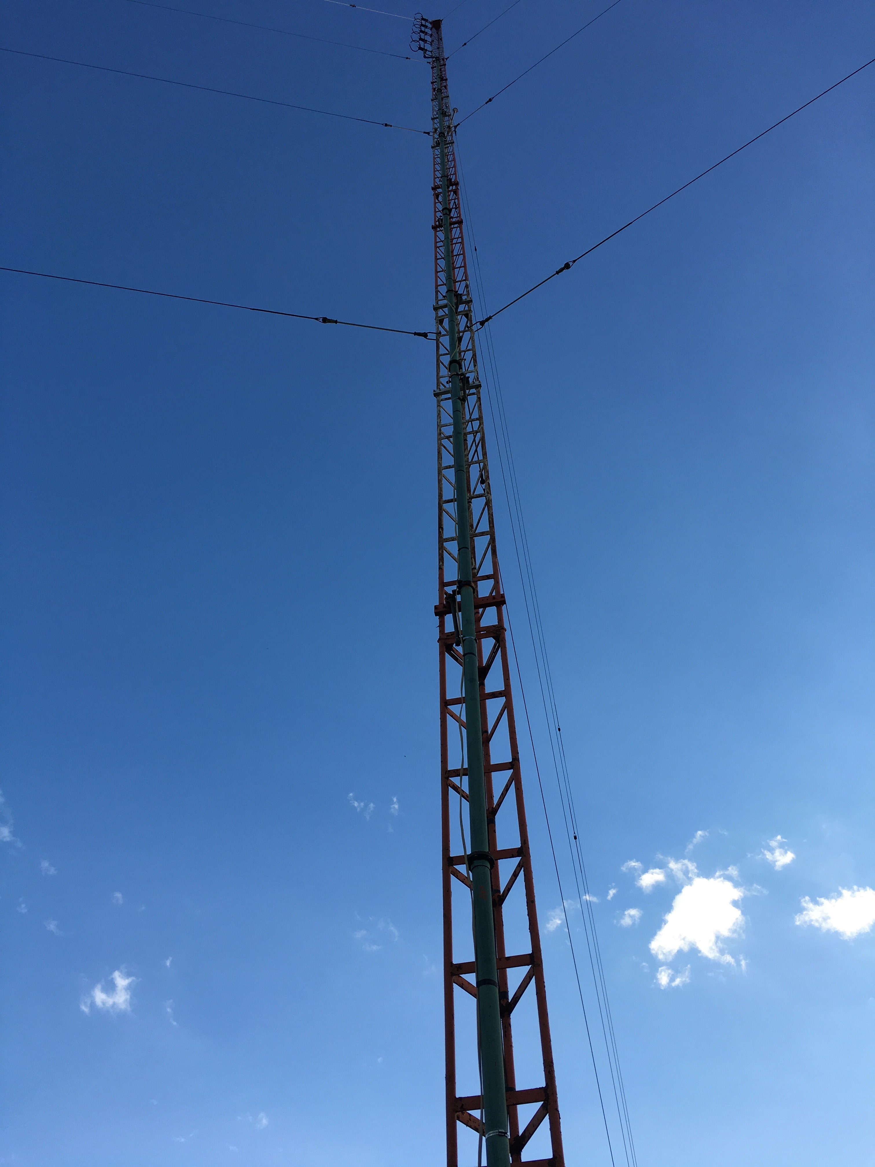 Tower 2 supports the decommissioned 5-bay horizontal FM antenna for WOIA (later WNRS and WIQB, now WWWW-FM) before the station moved to a different site in the 1970s. The copper 1-5/8 inch line remains in place, still grounded at the base.