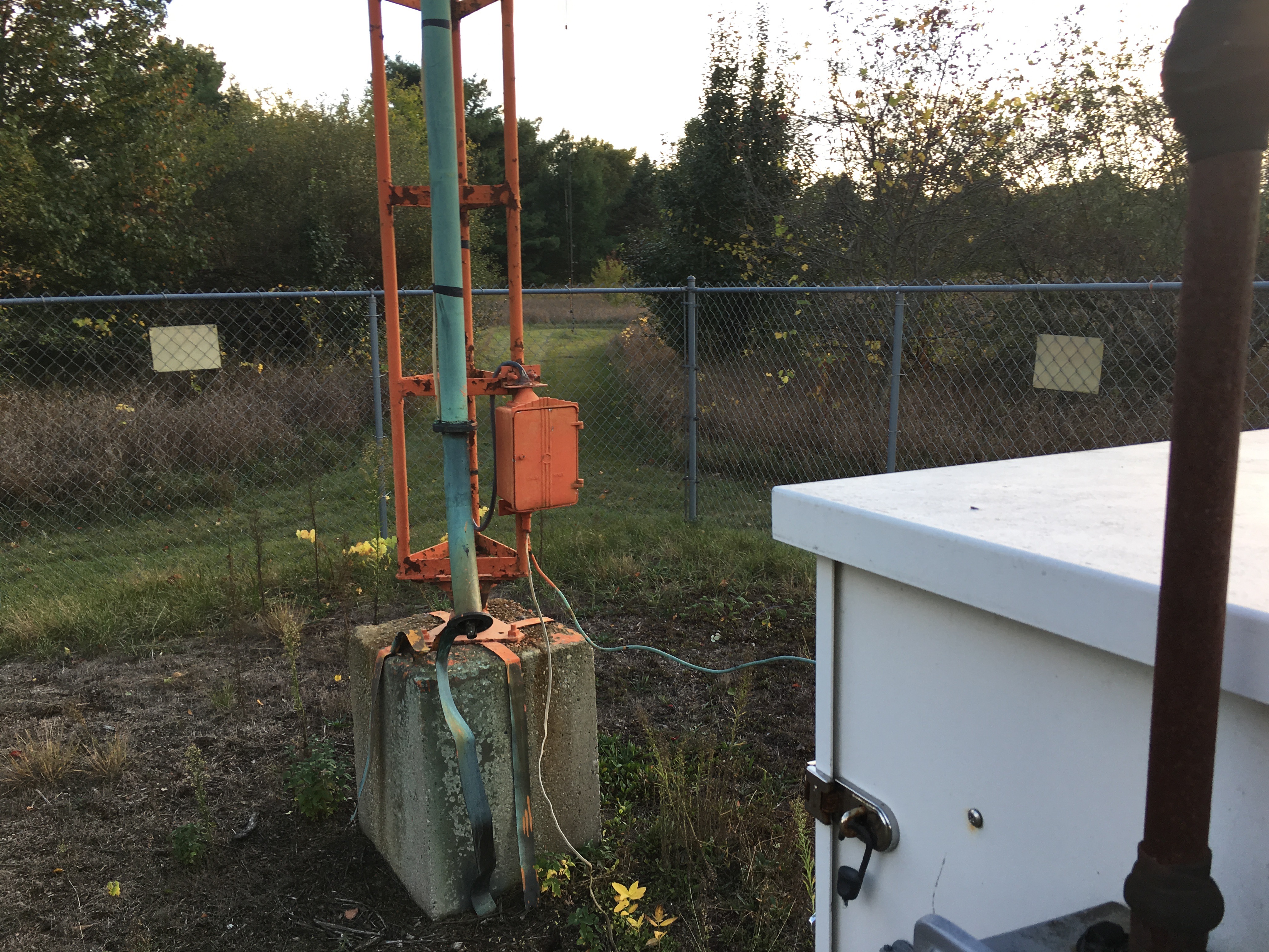 Another look inside the fence showing the base insulator and FM transmission line, capped and grounded.