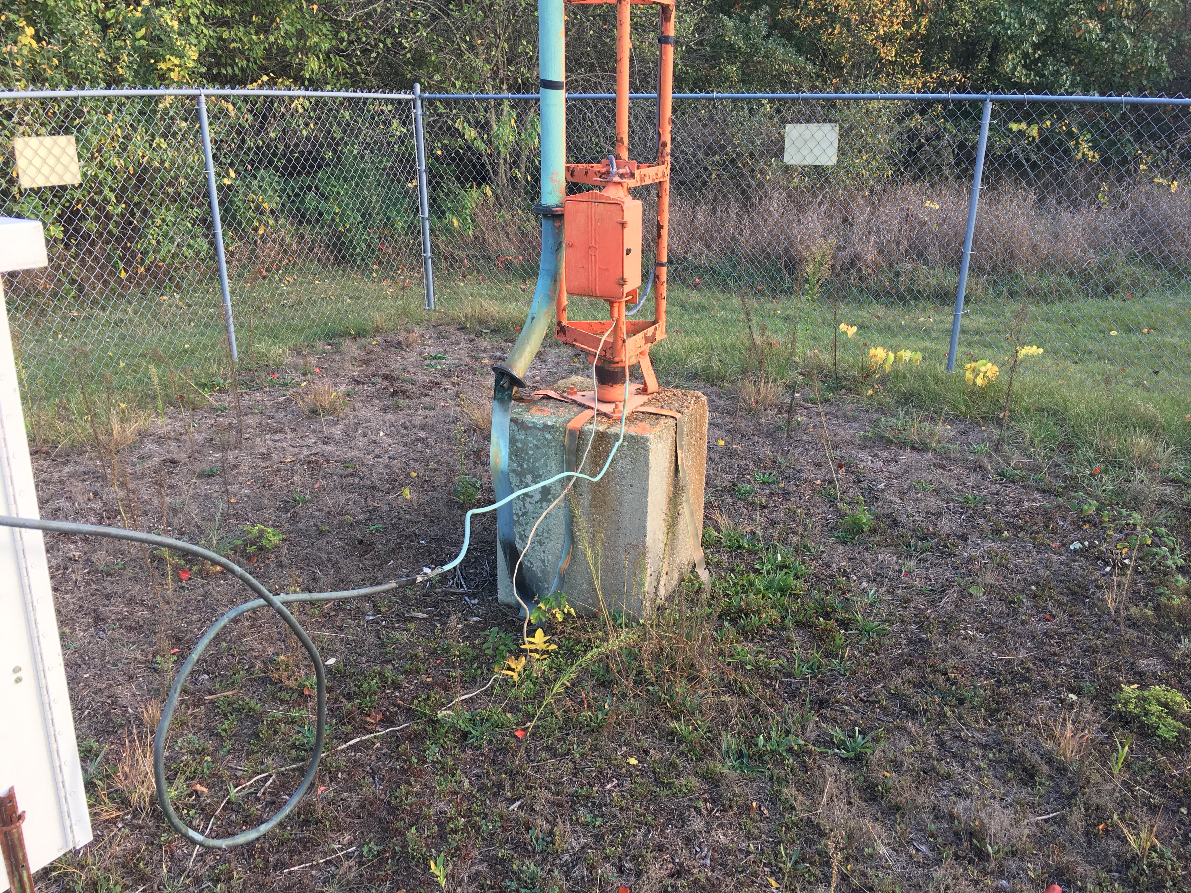 Another view of the base of tower 2 showing the FM line, the Crouse-Hinds tower lighting junction box and the one-turn lightning choke in the copper feedline between the ATU and the tower. Tower lighting has been removed because the towers are less than 200 feet tall.