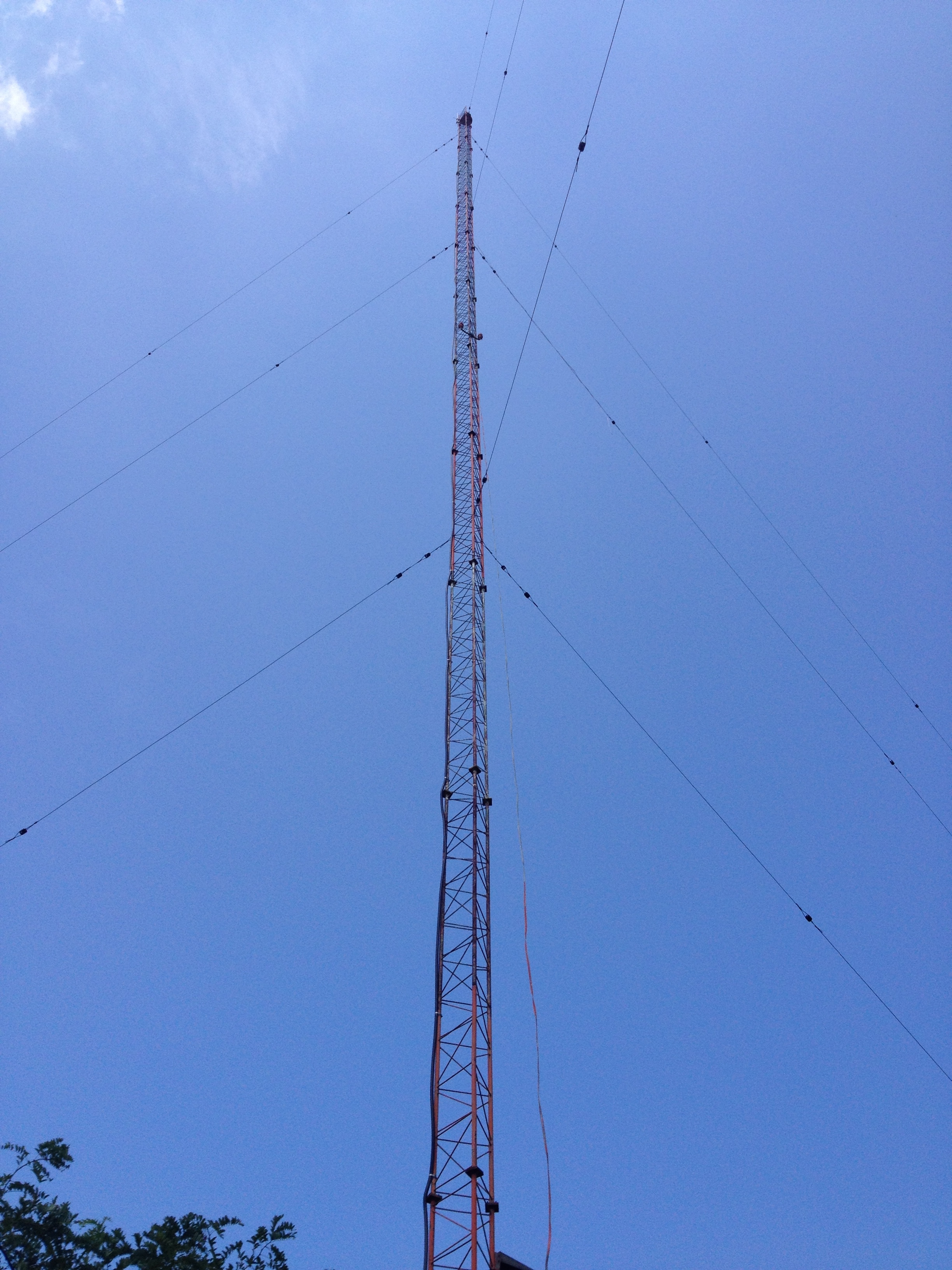 Looking up the northwest tower. The picture shows a communications type vertical antenna top-mounted, next to the lightning cage and beacon. The paint on the tower is understandably in very poor condition. The station received a license modification to discontinue antenna marking and lighting in the early 1980s, as the towers are less than 200 feet tall.