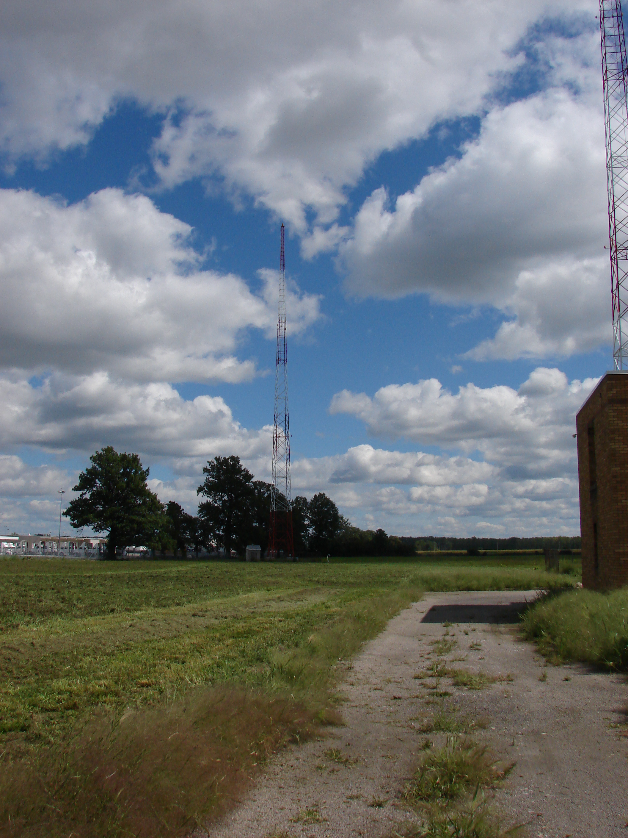 Tower 1 is nearest the building and tower 2 is in the distance. Towers are 214 feet tall, though they appear taller due to their construction and taper.