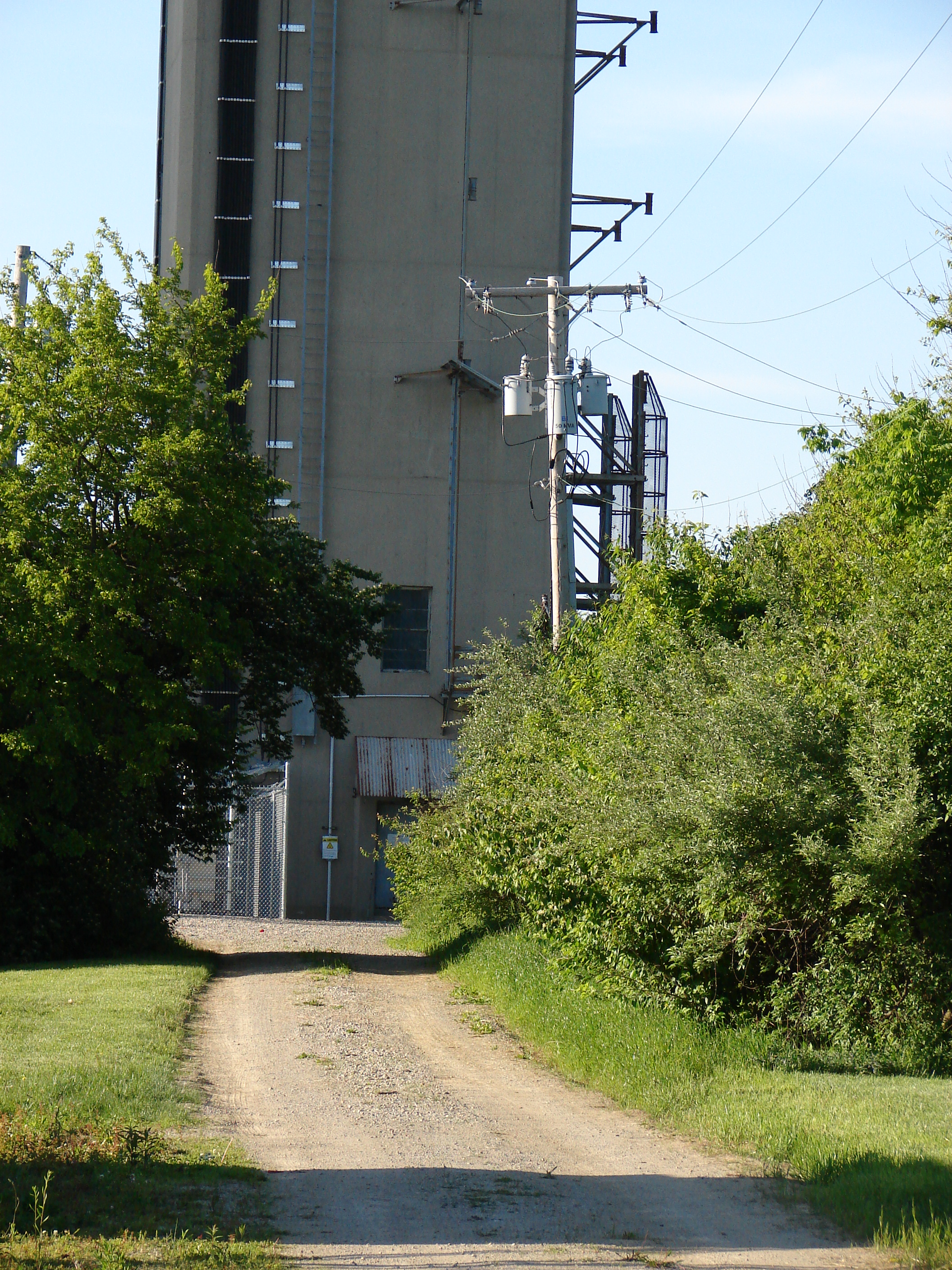 Looking up the driveway toward the tower. Cellular equipment can be seen enclosed by a cyclone fence. Heavy duty three-phase power is provided by the pole and transformers to the right.