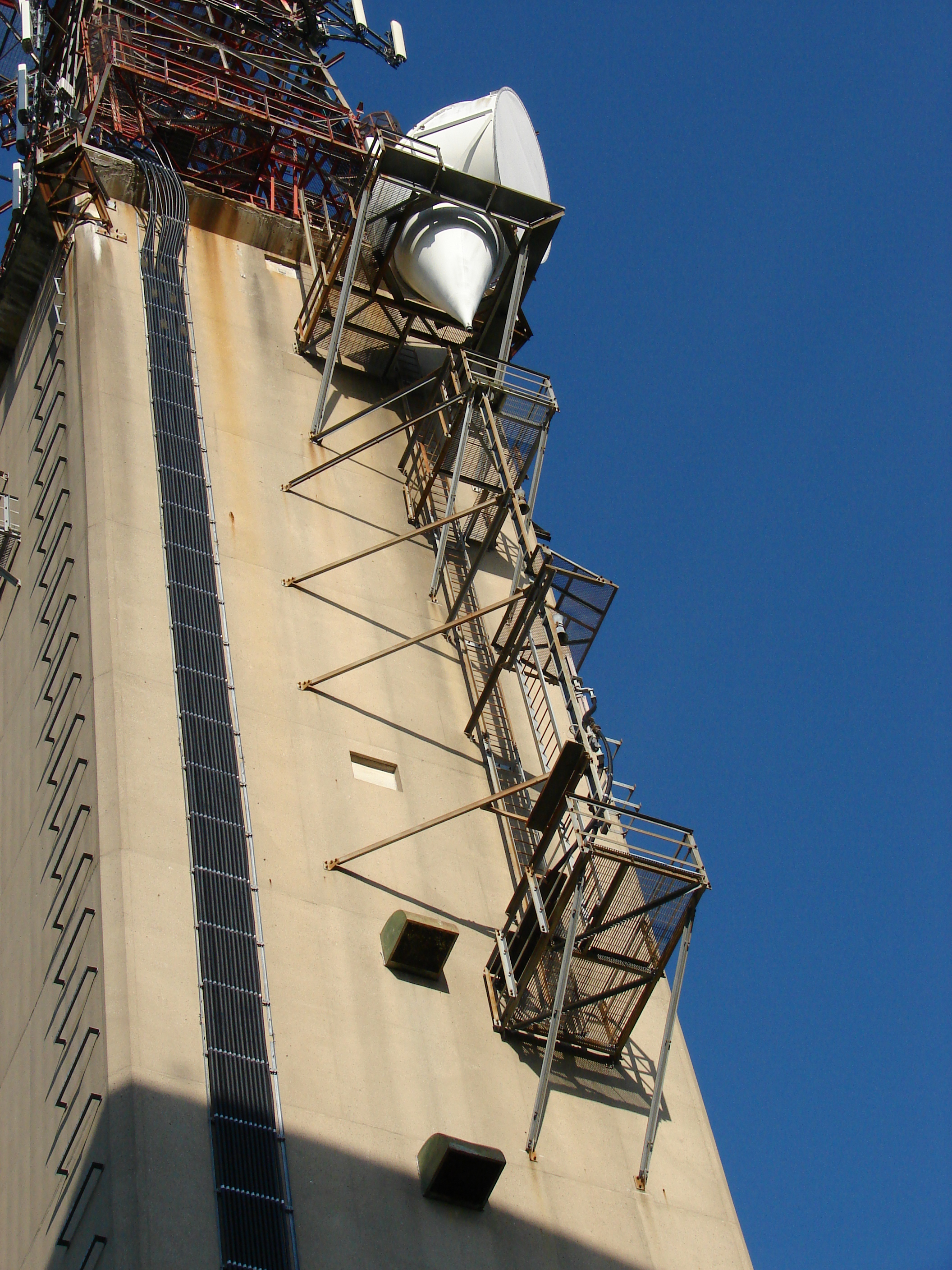 AT&T changed to these conical horn-reflectors sometime in the late 1960s, installing them instead of the original KS-horns. Apparently they were better optimized for the TH and TJ bands, whereas the KS-horns were originally designed for TD2 service and were later fitted for the higher frequency bands. Everything on the outside of the concrete tower was added after the fact, using the windows as doorways through which maintenance techs would climb out onto the platforms and up the ladders to align and repair these antennas - certainly not for the faint of heart!