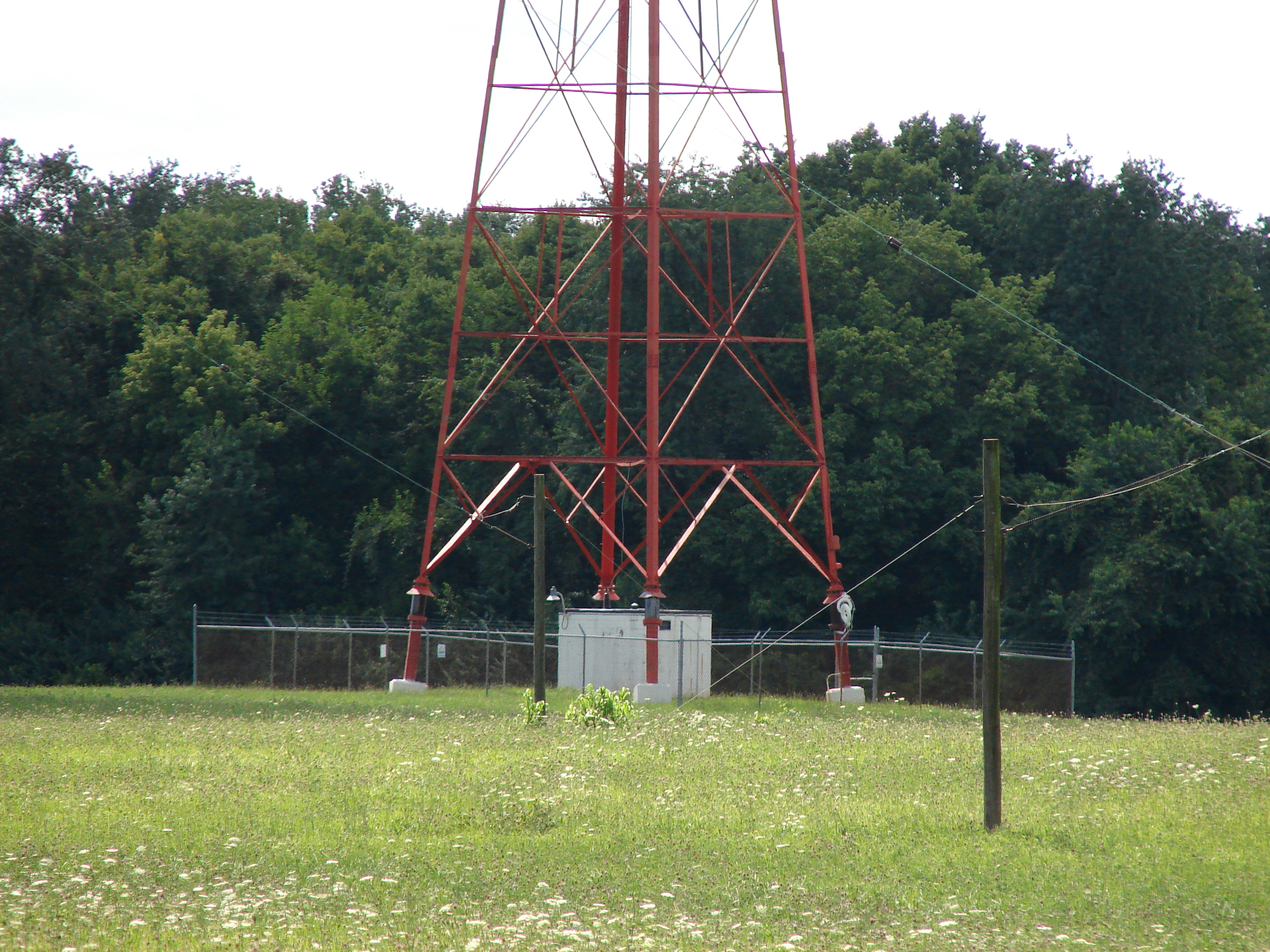 Tower 6 is the north center tower in the nighttime array. In the foreground, support poles for the top-loading of this tower can be seen.