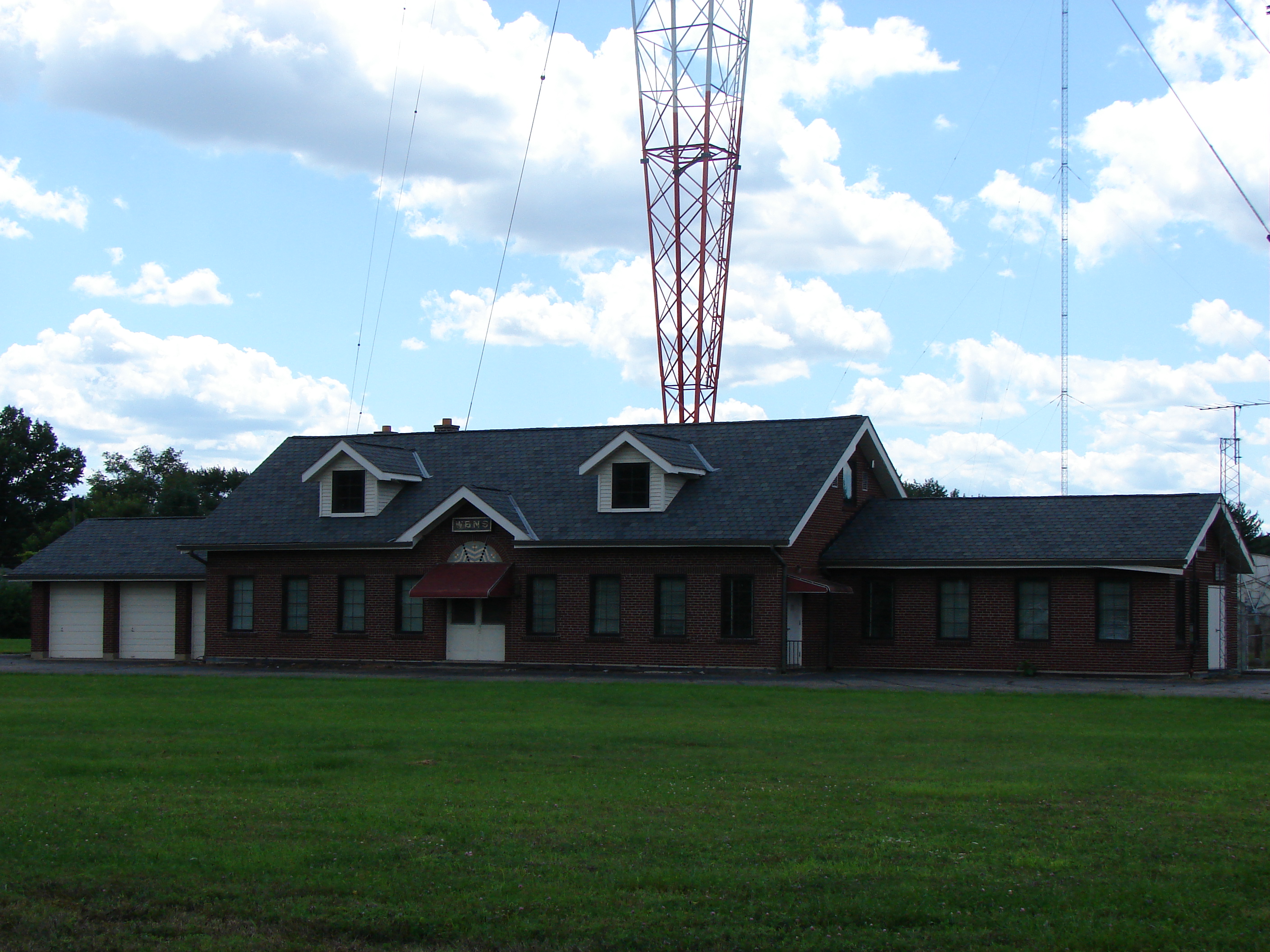The transmitter building with the daytime tower adjacent.
