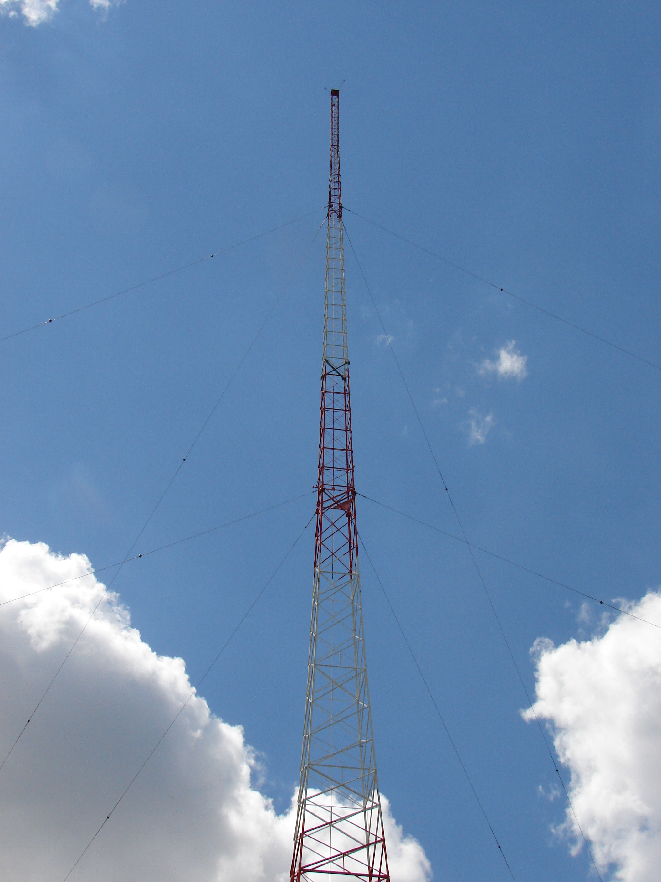 The upper half of the structure shows the additional guy wires that are affixed. Most of these Blaw-Knox towers are guyed only at the wide middle point, as that point serves as the base for what is essentially a self-supporting tower. It must have been decided that additional guys were necessary, as this is one of the smaller towers of this type to be built.