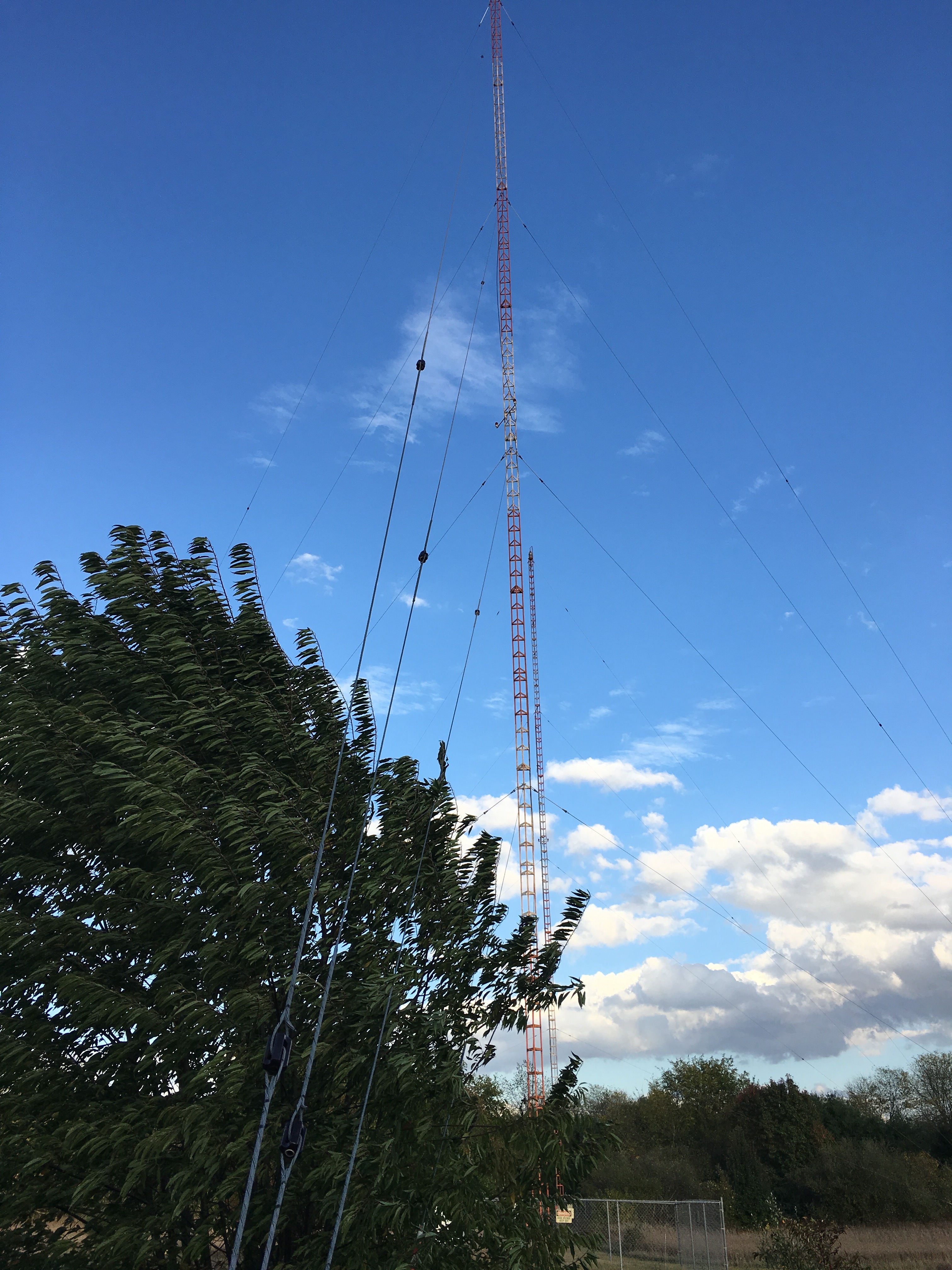 Tower 1 with guy wires. The site grounds are kept maintained with regularly mowed paths to the towers and guy anchors.