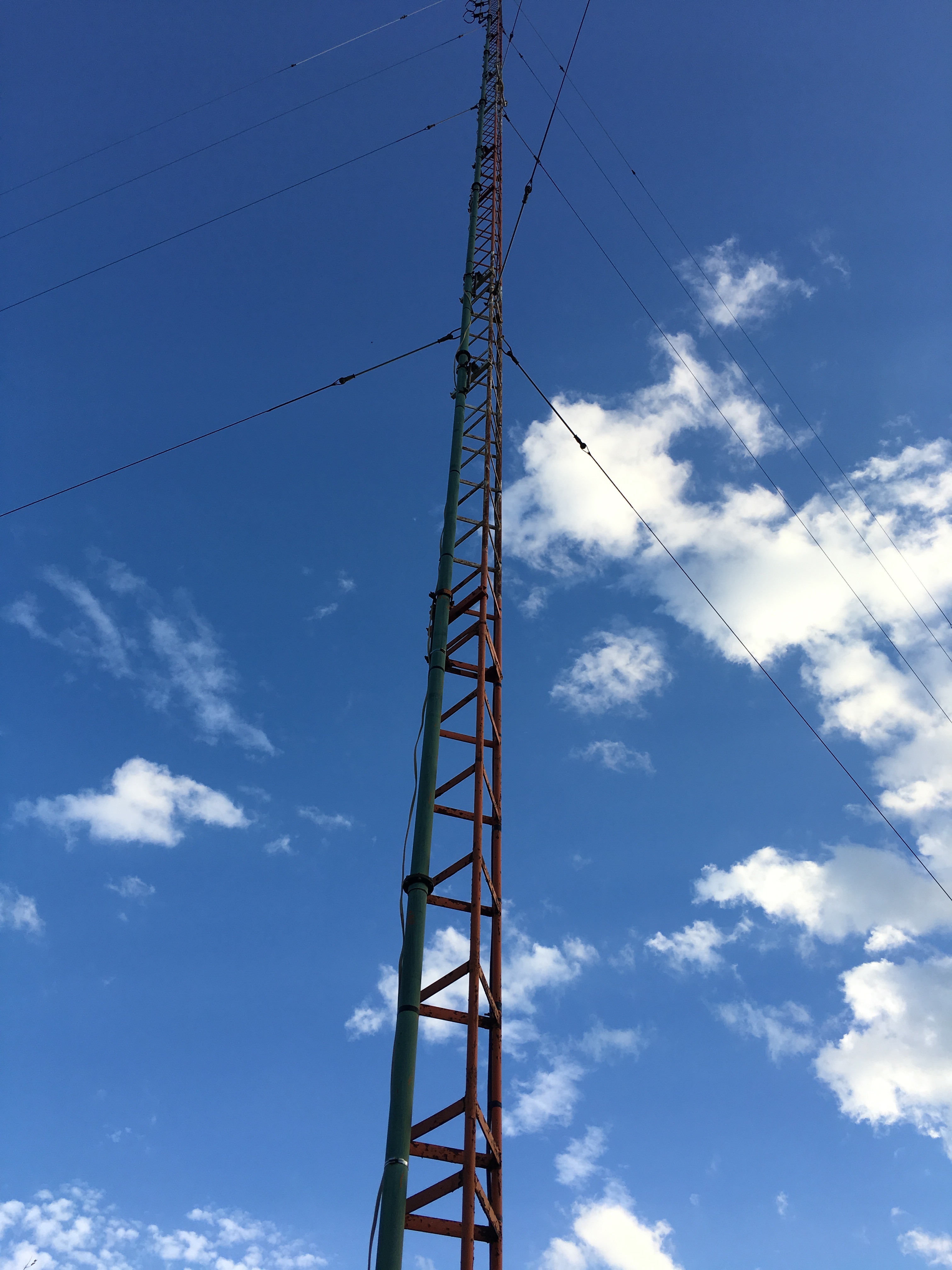 Closeup of some of tower 2 showing the FM line. The FM station (WOIA-FM) signed on in 1962 on 102.9 MHz. It was short-spaced to WBRB-FM, 102.7 in Mt Clemens on the other side of Detroit. It was one of the last FM stations authorized before the FCC changed to an allocation system based on station class, maximum power and distance separation. When the FM signed on, it was assigned the callsign WOIA and the AM station was reassigned WOIB. At the time, AM and FM stations could only share a callsign if they were licensed to the same city. In this case, the AM was licensed to Saline and the FM to Ann Arbor.