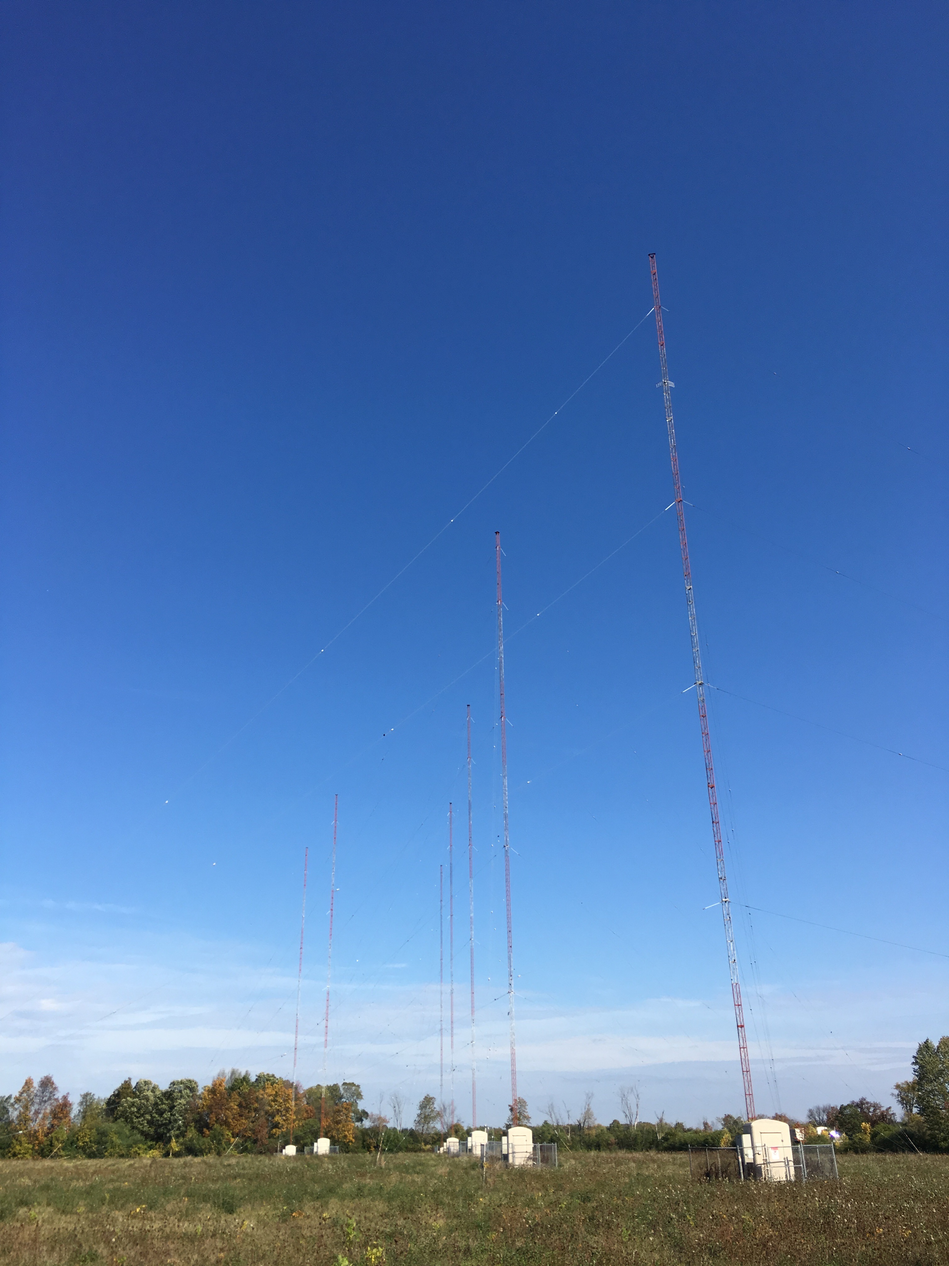 The day and night arrays are closely spaced, only a few degrees off azimuth. The four towers grouped in the center form the night array. The day array is the rightmost tower, the second tower in the night array, and the two to the left.