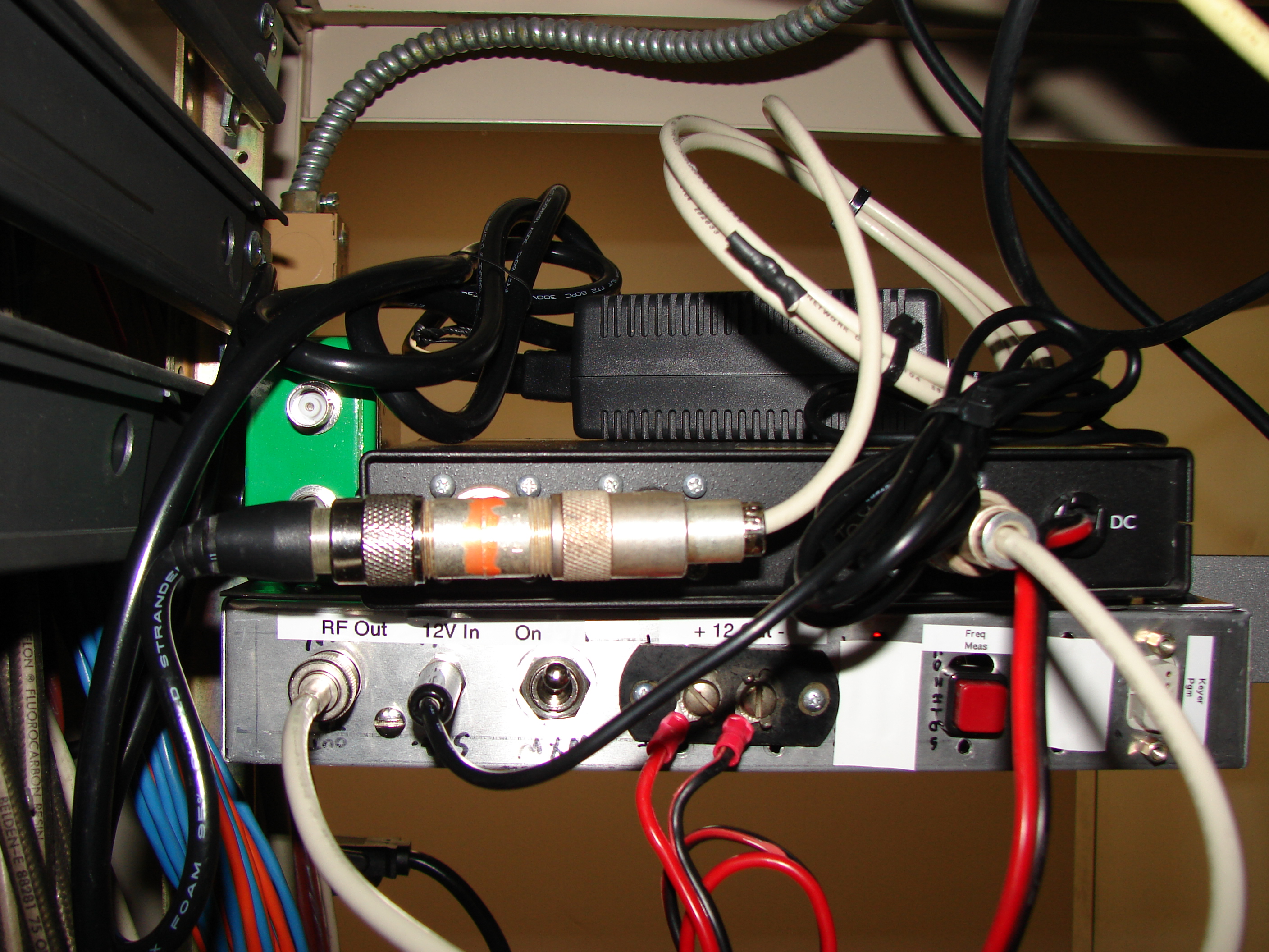 Beacon transmitter back view. Bottom chassis contains the ID-O-Matic keyer keying a Vectronics 1220 20-meter 1 watt transmitter. Its output feeds the transverter input. The transverter output feeds the antenna via the black coax. The coil of white coax is a shorted quarter-wave stub for harmonic suppression and DC grounding.
