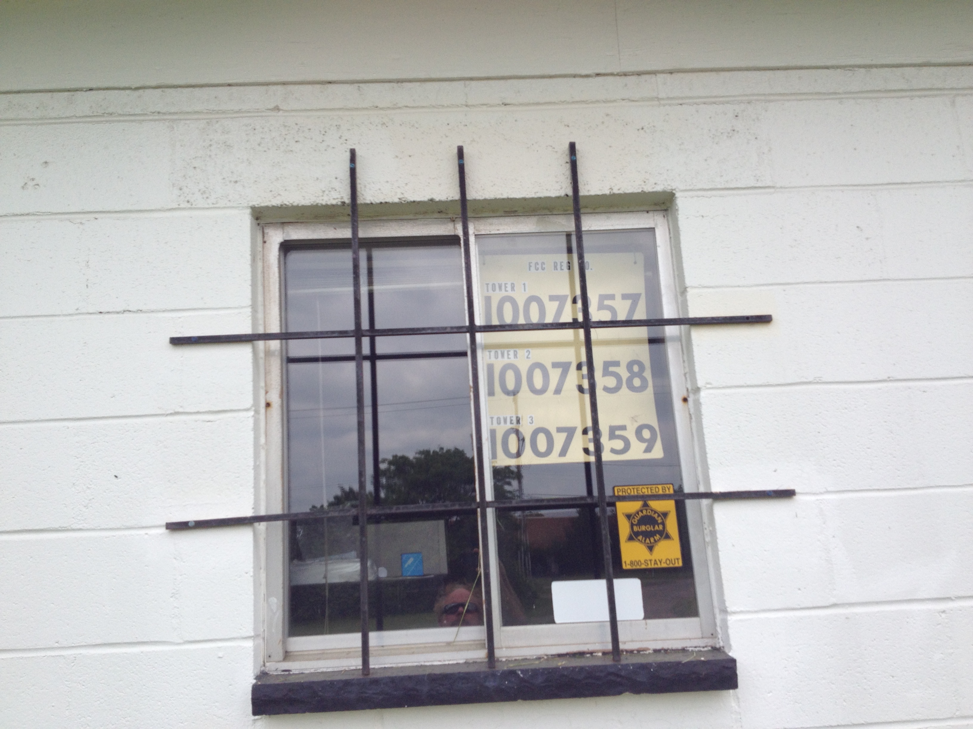Tower registration numbers in transmitter building window.