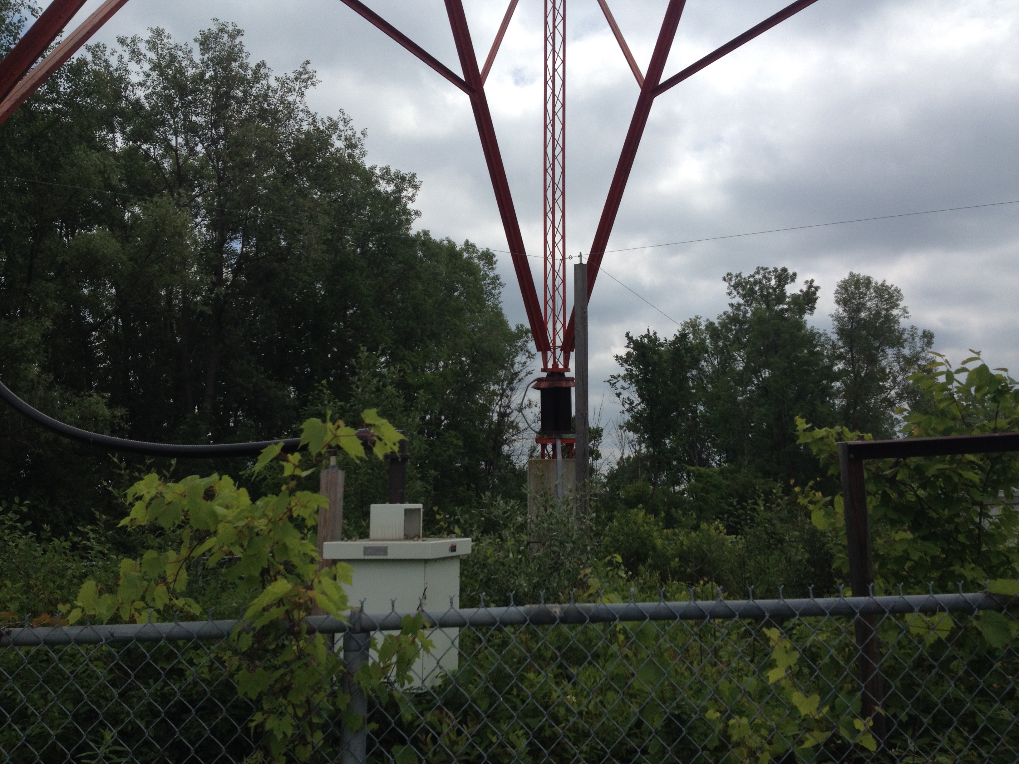 Base fence for tower #3 with isocoupler for WFBE FM feedline and south tower leg in the distance.