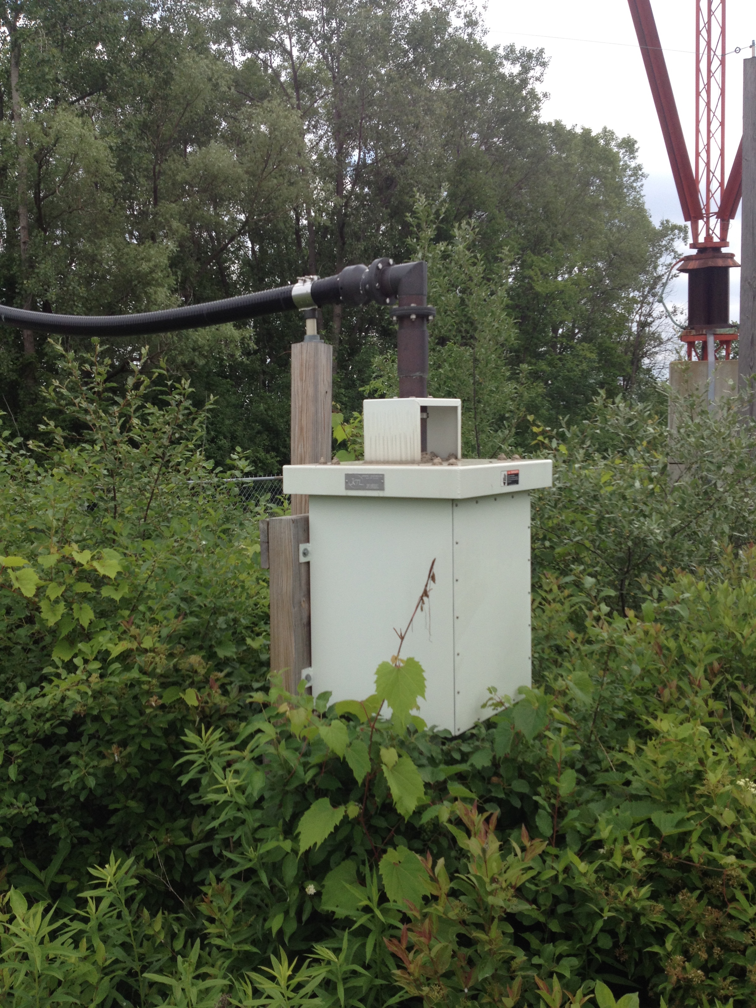 Closeup of FM isocoupler at tower #3 base. The 3 1/8 inch line is fed by an elbow at the top of the isocoupler and is supported by an insulator atop the wooden pole next to the isocoupler.