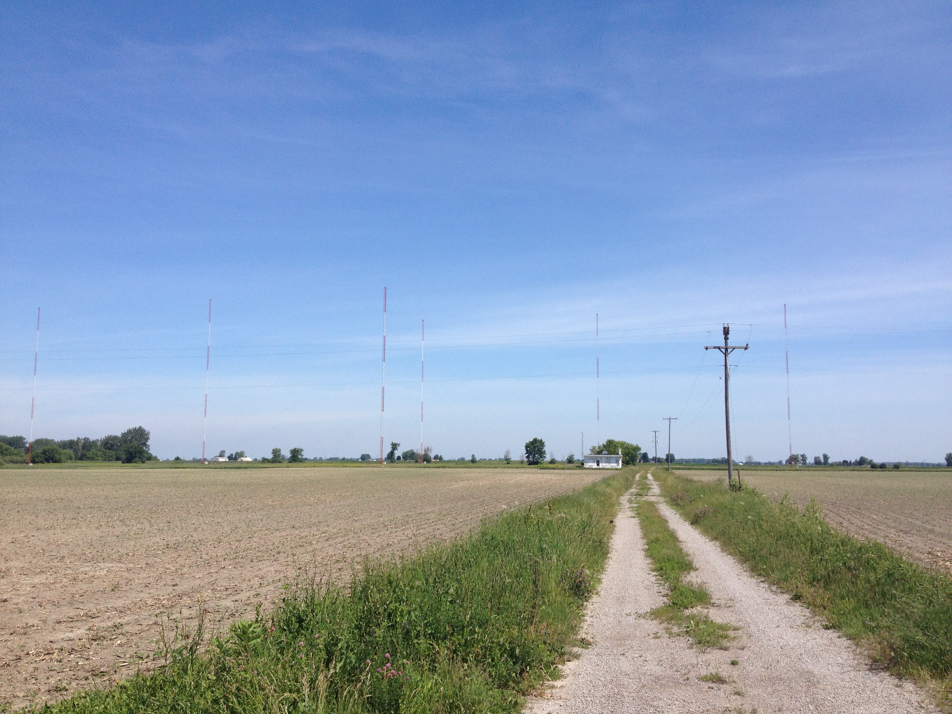 Another view from the driveway at Uncle Henry Road. Each row of three towers are not inline but form a dogleg bent inwards 5 degrees from a straight line. Also, the spacing between towers #4 and #5, and #3 and #1, is 94 degrees; the spacings from #5 to #6 and #1 to #2 is 90 degrees. The two rows of three are spaced 190 degrees apart.
