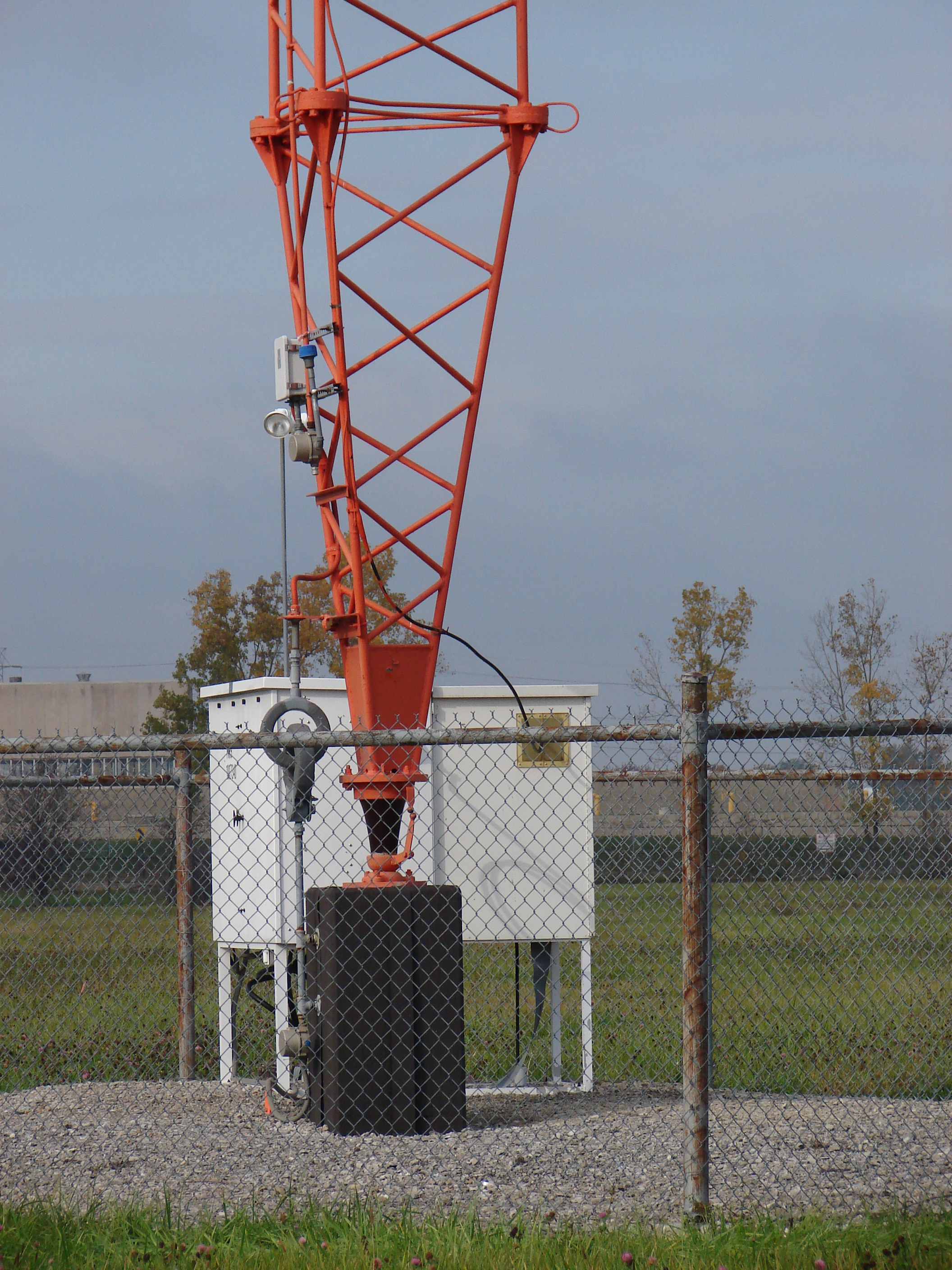 Base of tower #9 showing tuning house, Austin lighting transformer and pier/insulator.