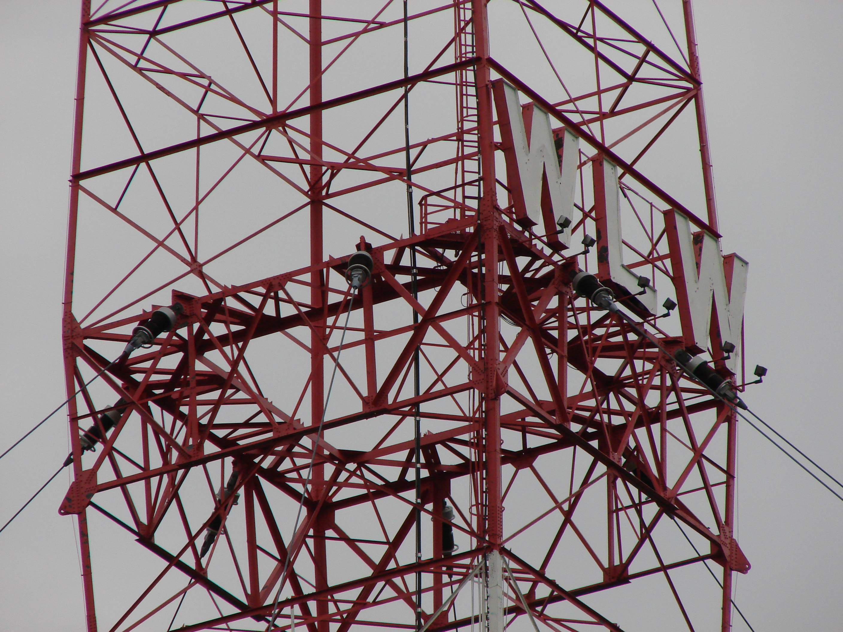 The call letters WLW are about ten feet tall and light up at night. They are mounted on the south face of the tower at the center.