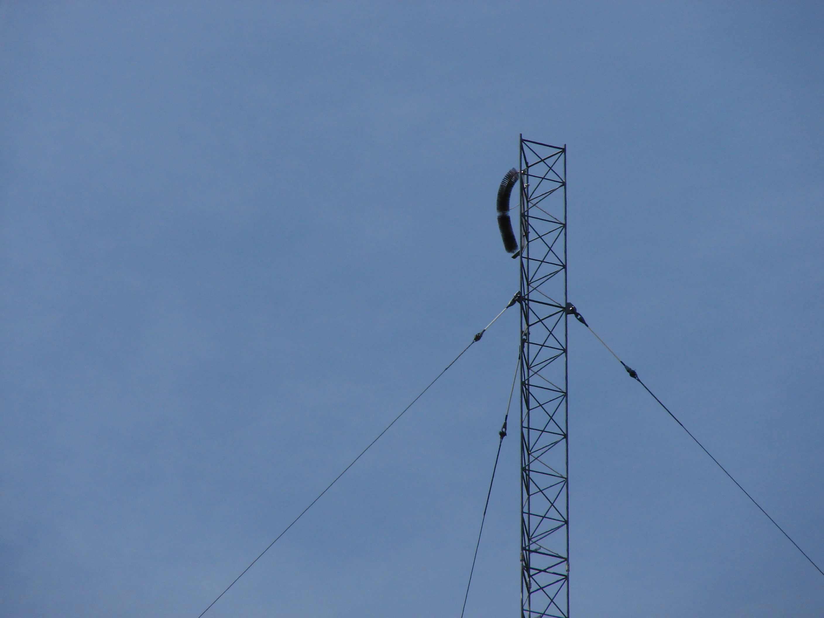 These bottle brushes at the tops of the towers help dissipate lightning. The towers are below the minimum height to require lighting.