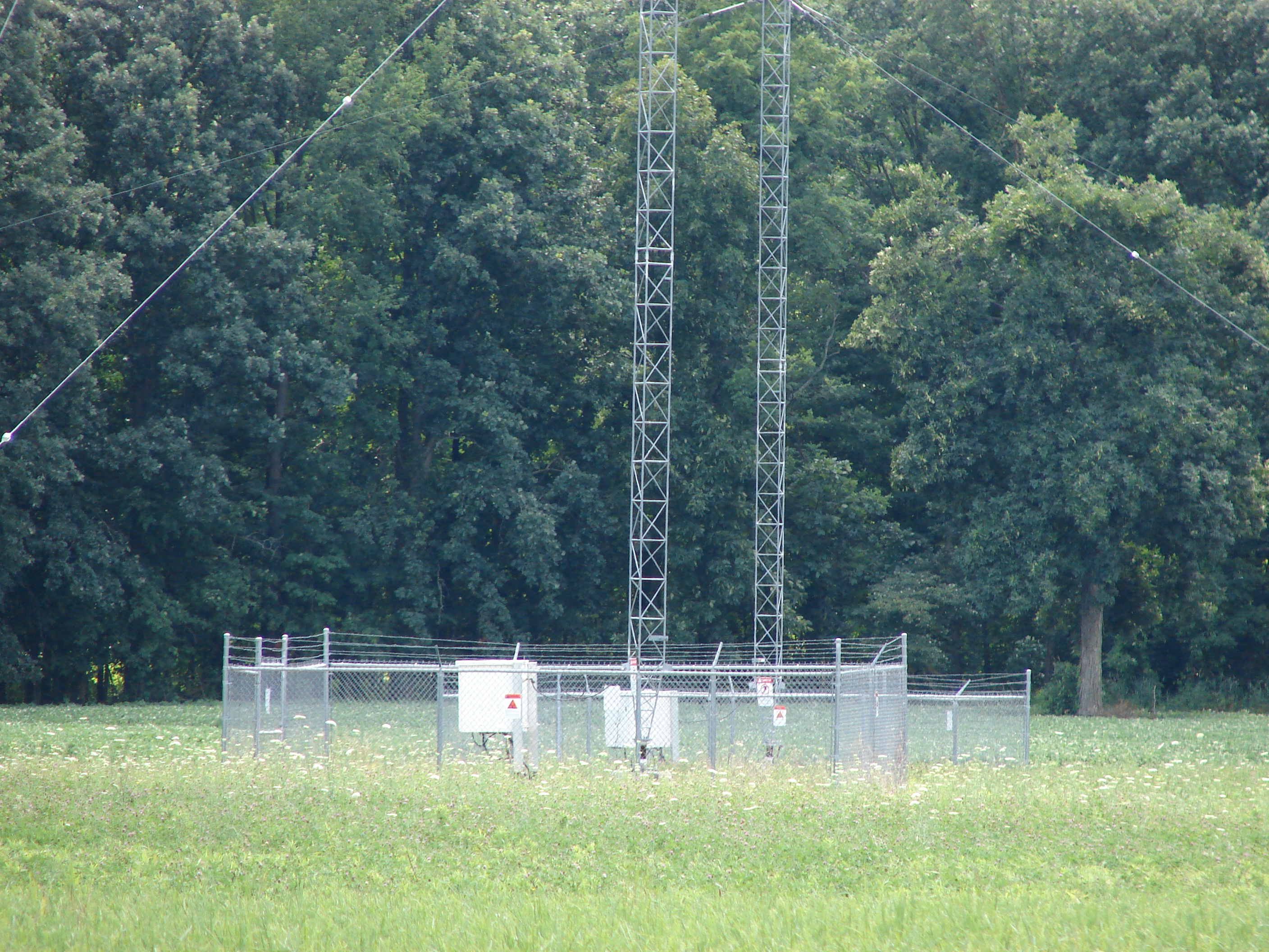 Cyclone fence around tower bases and guy anchor points. Towers 1 and 3 shown.