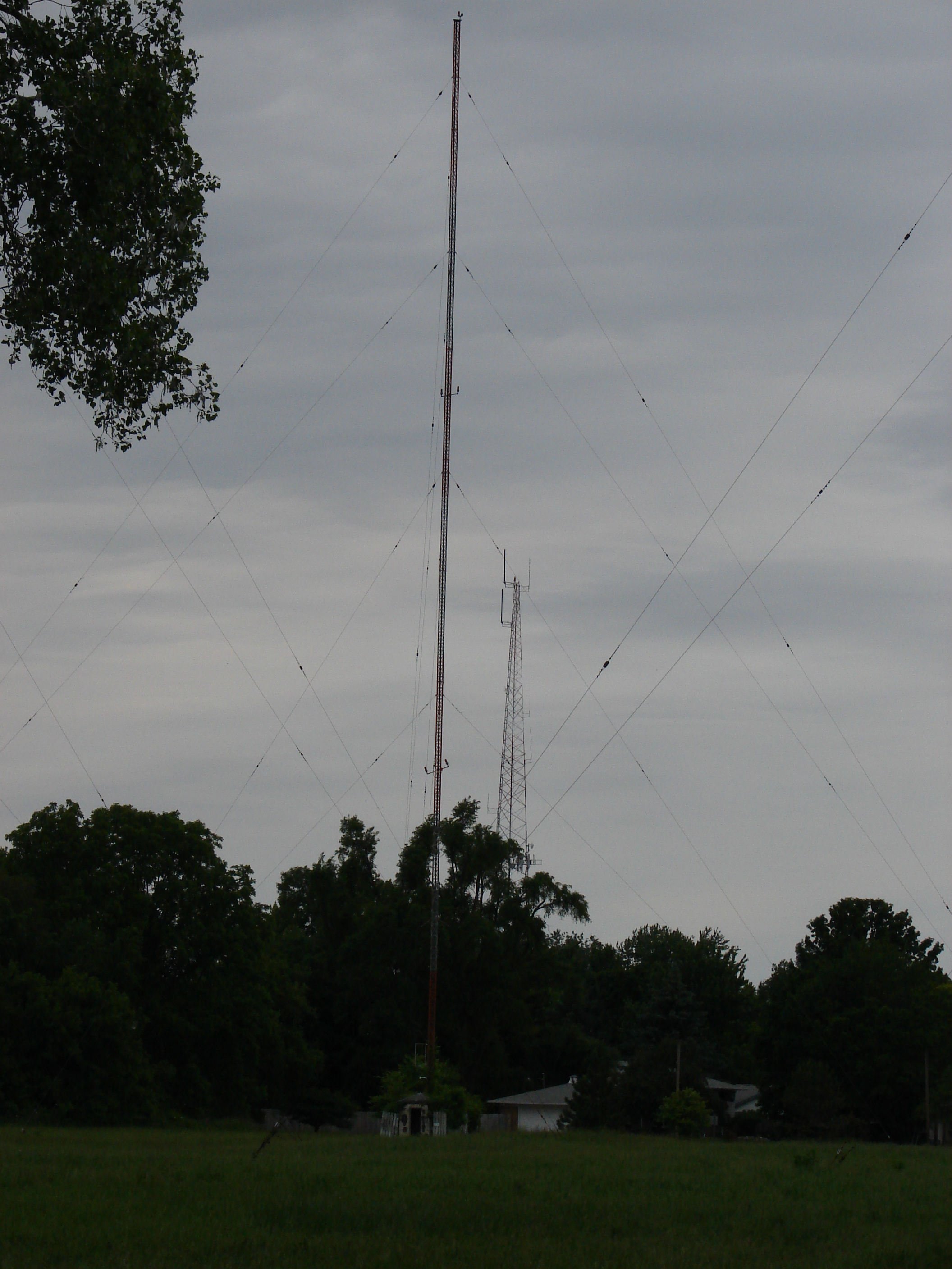 Northernmost tower in the array. The three towers are spaced 185 degrees on a true bearing of 315 degrees southeast to northwest. The Lansing Police tower is in the distance, about a half mile away.