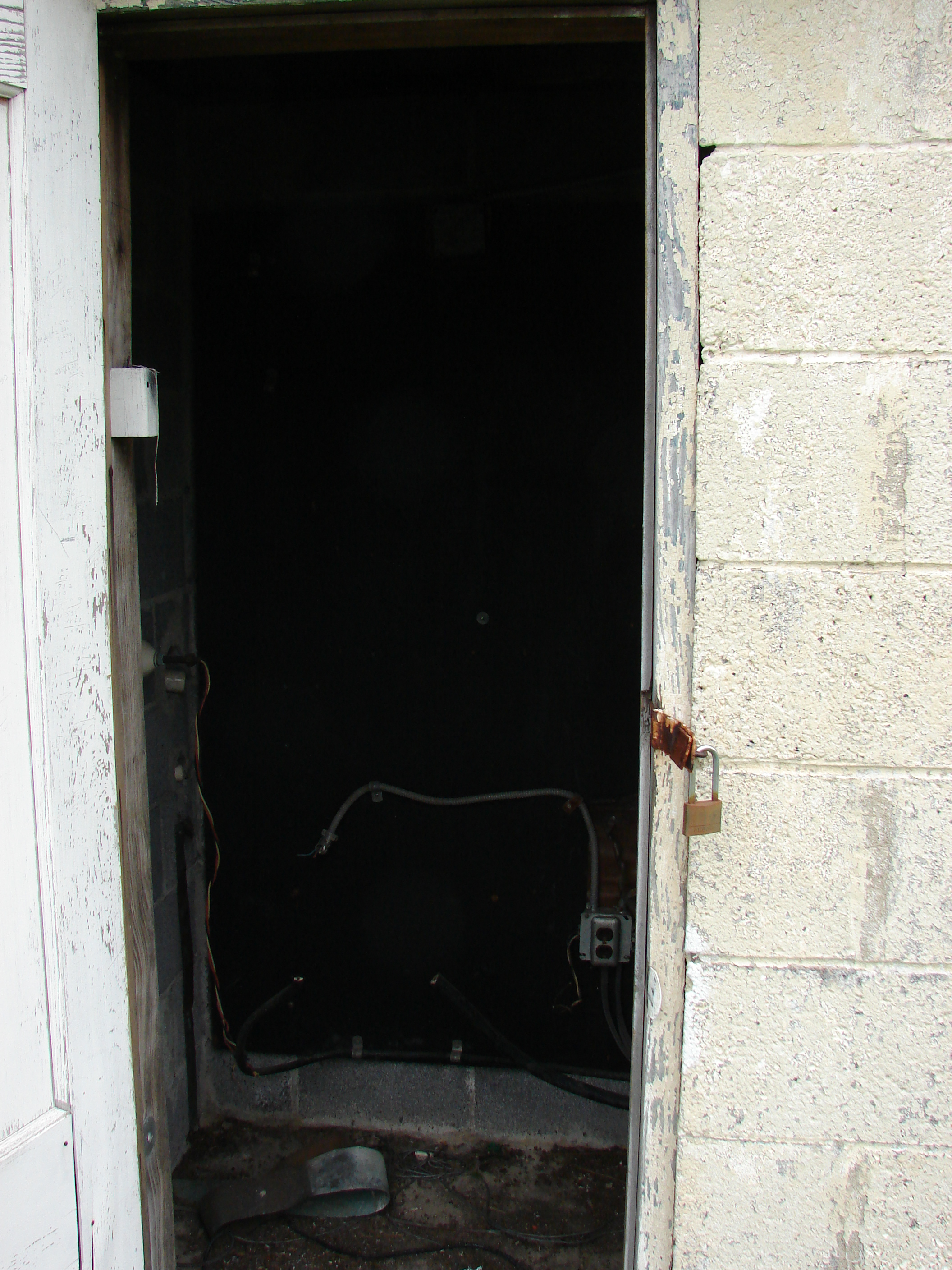 Not much remains to be seen. The bowl insulator can be seen at left. RF power was applied to the tower via a copper tube running from the output of the tuning network, which was mounted on a metal shelf, through the bowl insulator and onto the tower. The copper tube was coiled in one or two large loose turns as a lightning choke. If lightning should strike, it was hoped that the pulse would be stopped by the loose turns and encouraged instead to leap the "ball gap," which consisted of two steel balls on rods, one attached to the tower and the other to ground, in close proximity to each other, forming a spark gap. Inside the tube ran the three-conductor wiring for the tower lights. Inside the shack under the metal shelf was the tower lighting choke which served to isolate the AC power feeding the lights from the RF. The neutral wire was bonded to the tower structure, and through the choke, the tower was (as described by the station's first chief engineer John Whitacre) "both AC- and DC-wise grounded".
