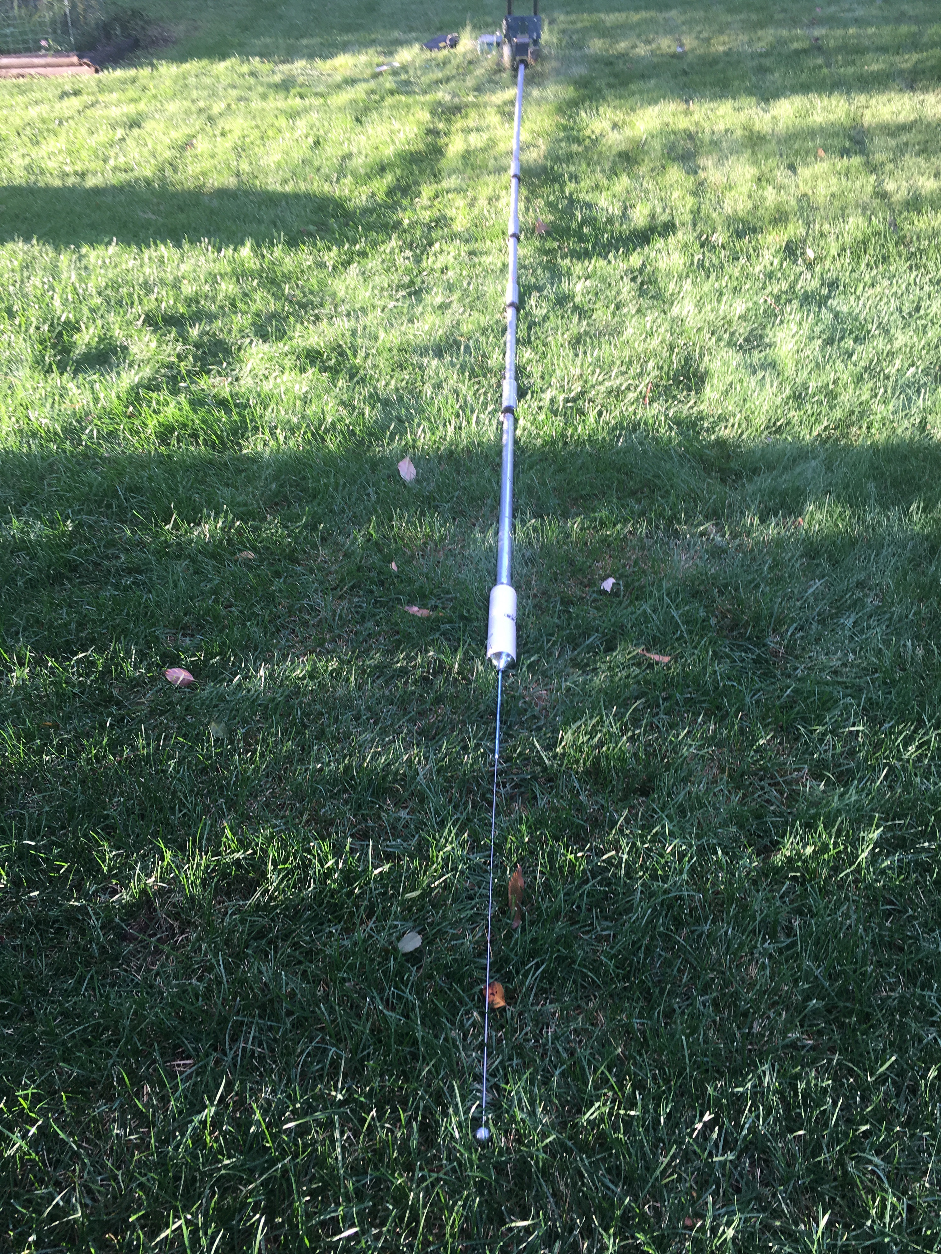 Looking back toward the base mount. The top hinges down to the ground for adjustment and maintenance. It lies in the neighbor's yard when it's down. Fortunately, I have a nice neighbor who also lets me use his trees for securing wire antenna ropes. The white tube is the 80 meter resonator.