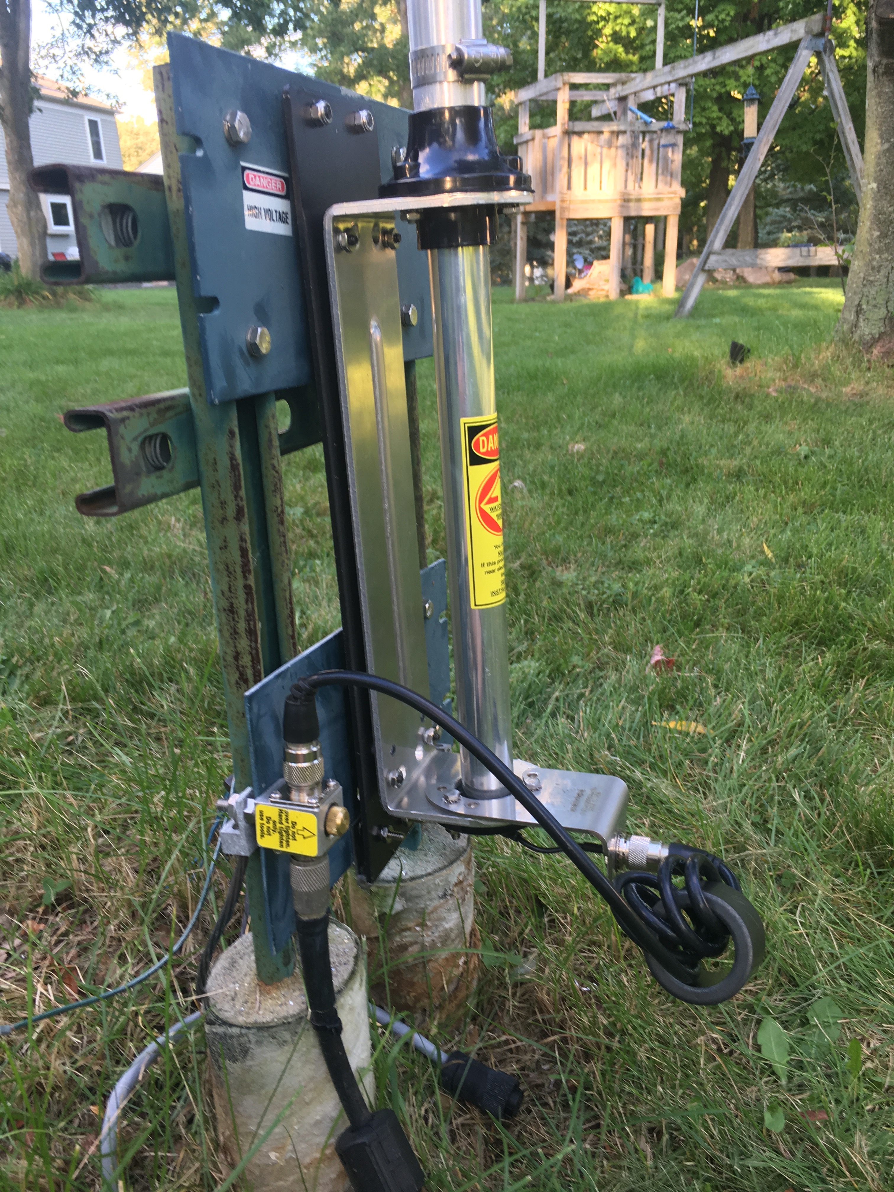 The antenna is up. The black plate, when upright, mounts to the top green plate with two 10-24 bolts installed into the green plate. Care was taken to ensure that the hardware was installed in such a manner that the antenna is vertical, as verified with a bubble level. The feedline from the shack comes in to the bottom of the spark gap, and the feed to the antenna is a short piece of RG8/X wrapped around a ferrite core for common mode current rejection. I have since installed a right-angle UHF connector on the top of the spark gap to alleviate strain on the RG8/X jumper, particularly when hinging the antenna down.
