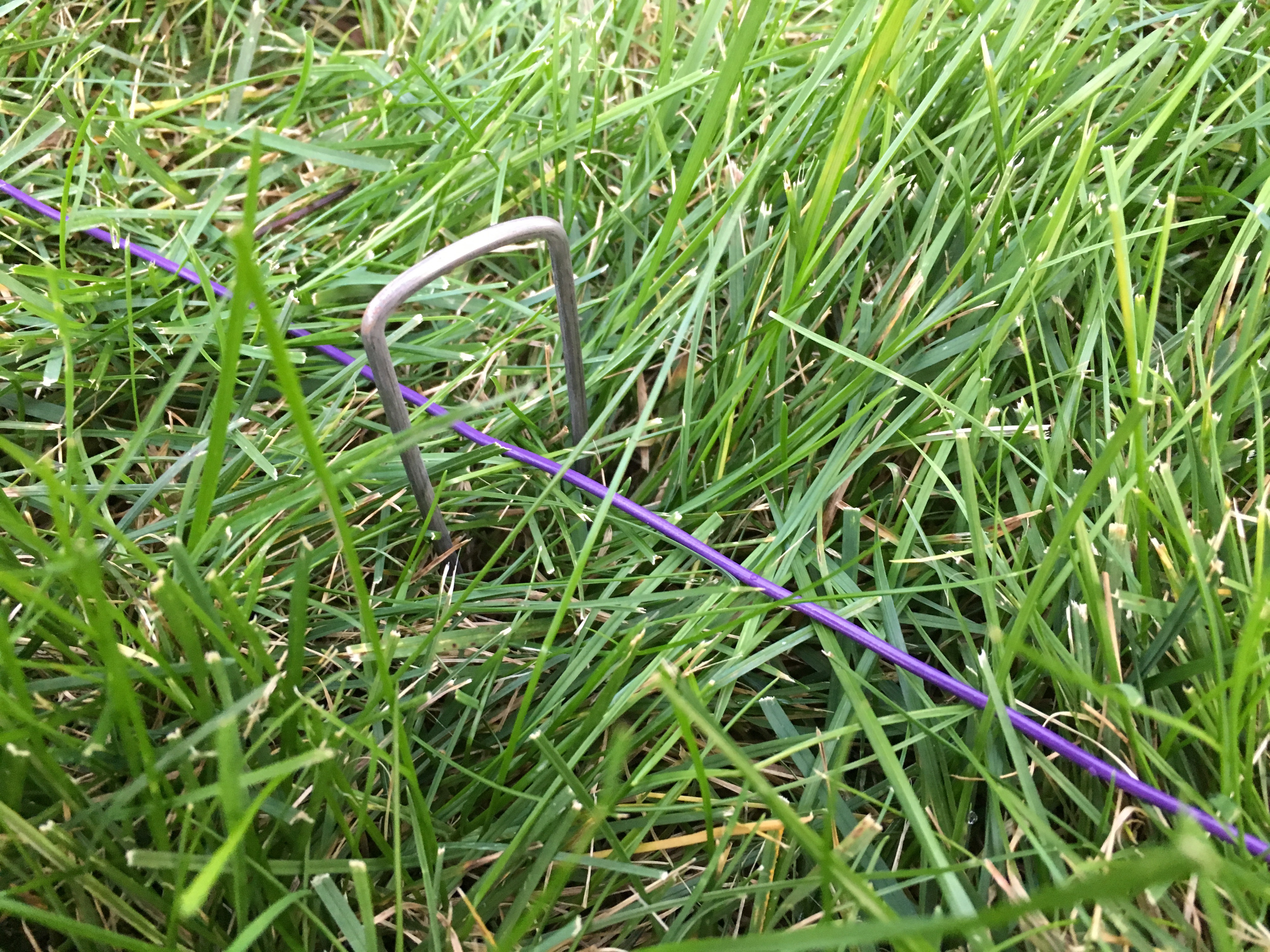 The radial wires are laid along the ground, and with time, the grass will grow up around them and they'll get buried just below the surface by thatch. Here, you can see the landscaping staple for holding the wire flush with the ground surface, taken just before pushing the staple flat into the ground. It takes from one to four staples to secure each wire, depending on length. Some wires are as short as five feet (where they abut the property line) while others are as much as 50 feet long. With ground-surface radials, length matters less than having as many wires as you can install. Hustler recommends at least twenty.