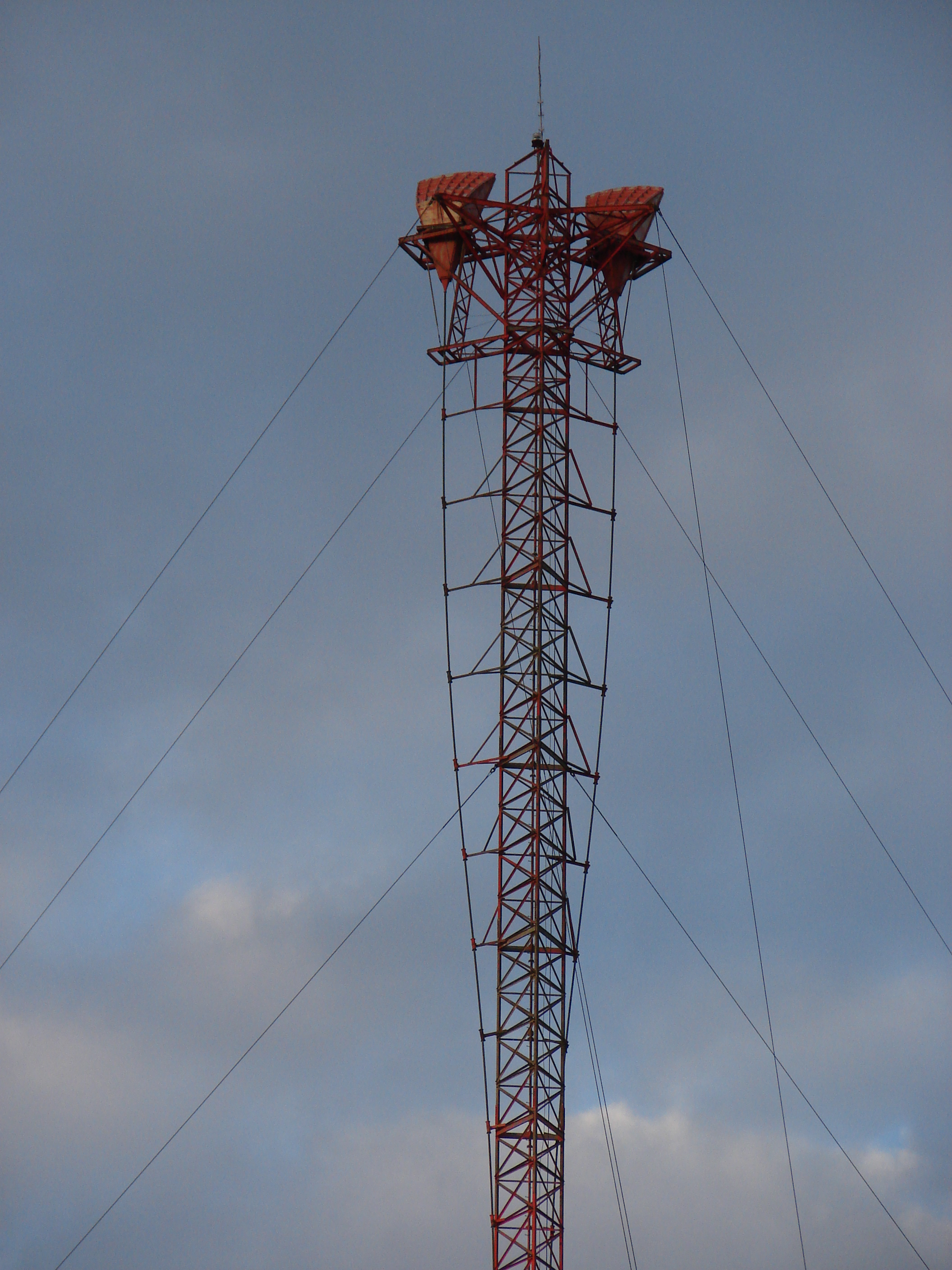 These KS-horns communicate with the downtown Columbus site. They are top-mounted on the tower adjacent to the building. Most likely they were elevated to allow use of the higher frequency bands that were put in service after the concrete tower was built. The tower has additional bracing and guying because of the large windload the KS-horns present as well as the need to minimize twist, which would distort the path and result in signal loss. The struts extending outward below the antennas support the circular waveguide.