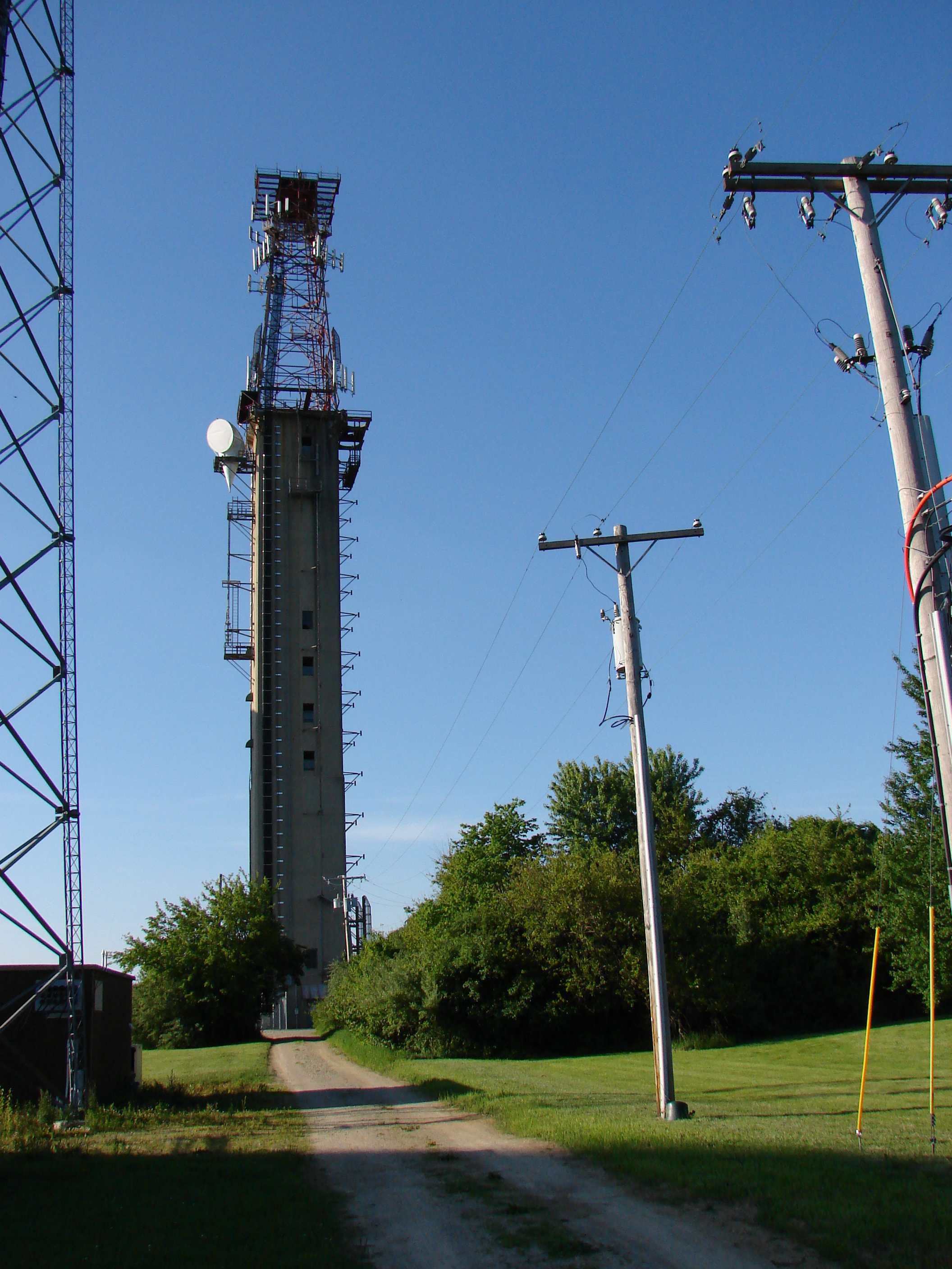 View of the tower from the driveway at the street. The tower is located on East Lytle Five Points Road east of the town of Springboro, adjacent to the municipal water towers and the fire station. The imposing structure can't be missed, and can be seen from Interstate 75 over two miles to the west. I could also see it from the window of my hotel room in Centerville, several miles to the north.