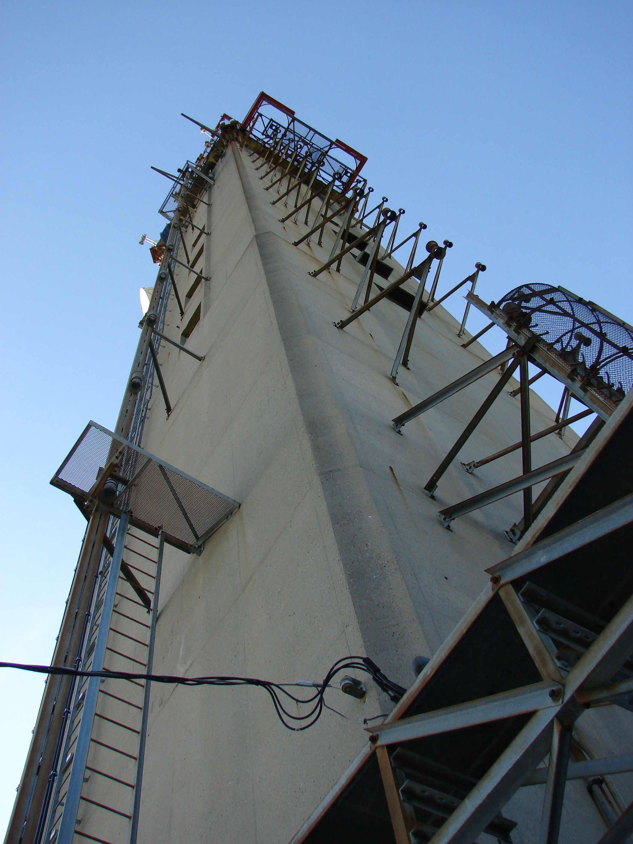 The brackets that once held the side mounted horn antennas and feedlines can be seen. The equipment for these antennas was located in the auxiliary building adjacent to the tower.