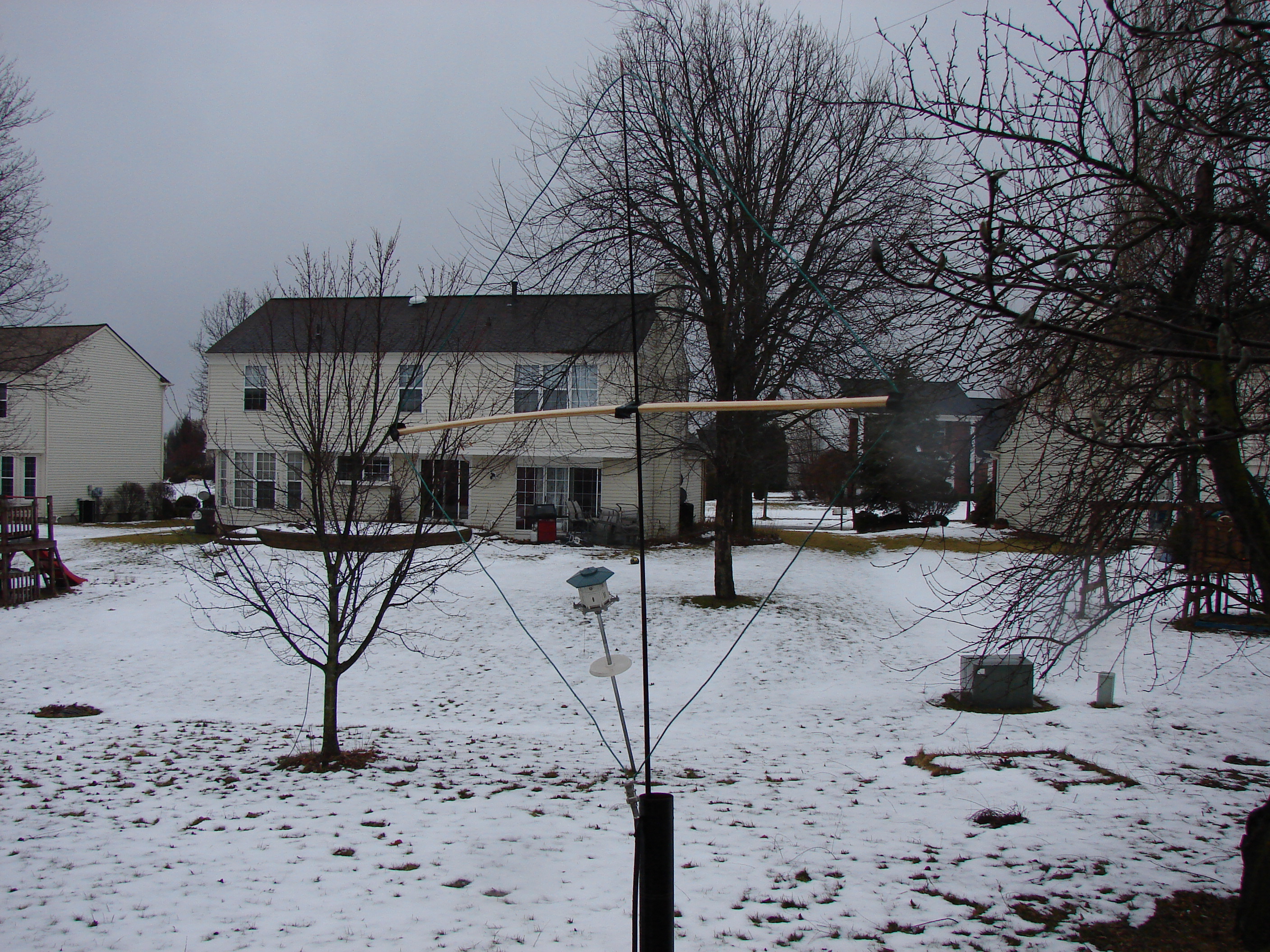 There is a hole drilled in the middle of the moulding so it fits over the fibreglass mast, and holes at each end for threading the wire through. The wire is terminated in a BNC connector. (The bird feeder in the background has since been removed and that spot is now the location of my 30/15 meter vertical.)